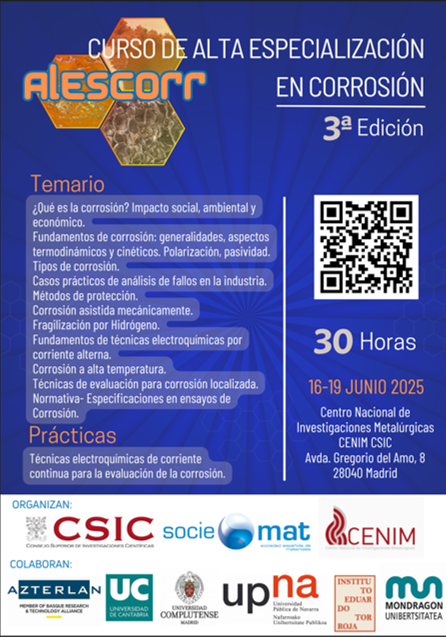 Del 16 al 19 de junio de 2025 tendrá lugar en el Centro Nacional de Investigaciones Metalúrgicas CENIM CSIC, Madrid, la 3ª edición del Curso CSIC SOCIEMAT de Alta Especialización en Corrosión ALESCORR 2025. Este curso, de 30 horas de duración, se encuentra dirigido a profesionales que se inician en el campo de la corrosión o que buscan un curso de actualización y se centrará en los fundamentos básicos de la corrosión y en el empleo de diversas técnicas electroquímicas para su estudio, alternando clases teóricas con prácticas de laboratorios y análisis de casos reales. El objetivo de esta actividad formativa es que el alumnado sea capaz de identificar problemas básicos de corrosión, así como aplicar las técnicas electroquímicas para determinar el mecanismo y la cinética del proceso.