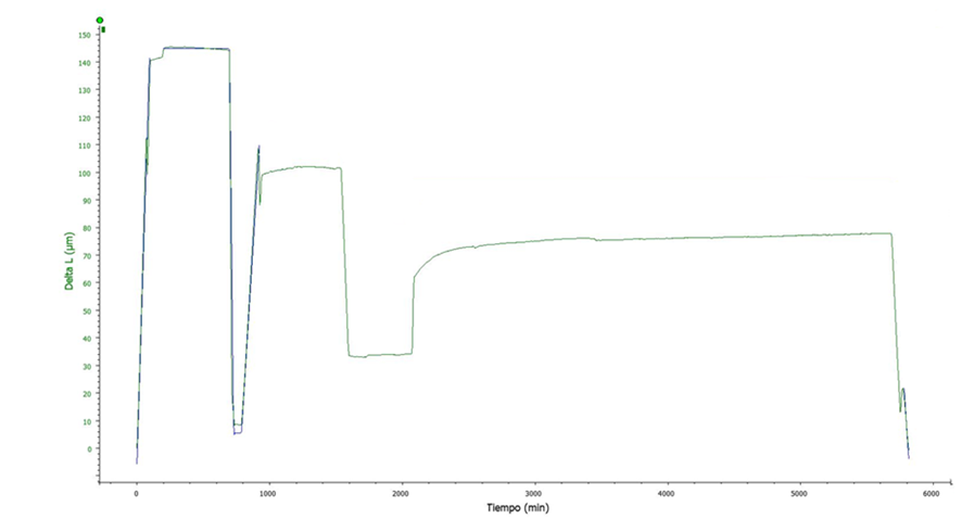A dilatometry experiment was performed to assess the effectiveness of the proposed approach. The dilatometric cycle simulated a forge in-line heat treatment with two furnaces. The simulated process required first a quick grain size recovery, performed with direct water quenching from the forging press and immediate austenitizing for 10 minutes at 850ºC in the first furnace. The accelerated ferrite-pearlite transformation was simulated for the second furnace. The parts are fed to second furnace after a forced air cooling to conditioning of the part to a temperature of 570ºC. This temperature is held for 8 minutes for nuclei generation and a final ramp up to 680ºC for one hour is aimed to nuclei growth. Figure 1 shows thermal profile of the dilatometer programming.