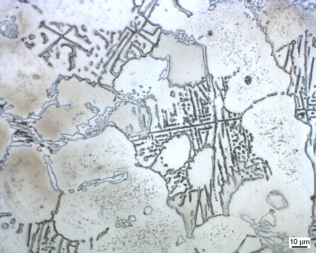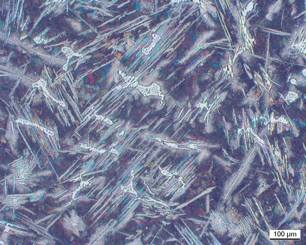 “Metallic storm” Acicular carbides in perlitic cast iron.
