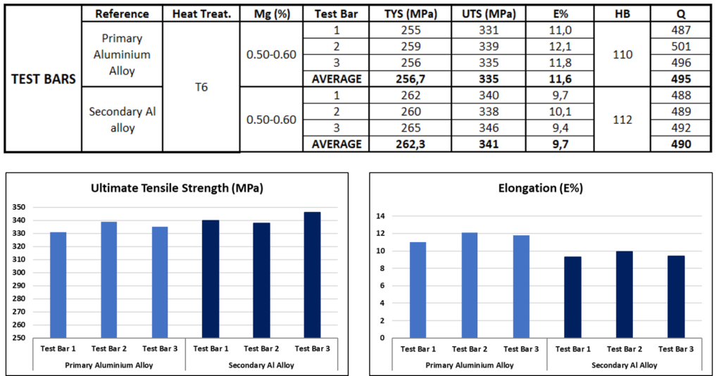 Las tablas de la derecha muestran las propiedades presentadas por una aleación desarrollada a partir de aluminio recuperado frente a las presentadas por un aluminio primario. Los resultados obtenidos muestran propiedades positivas de dureza y elasticidad del aluminio secundario.