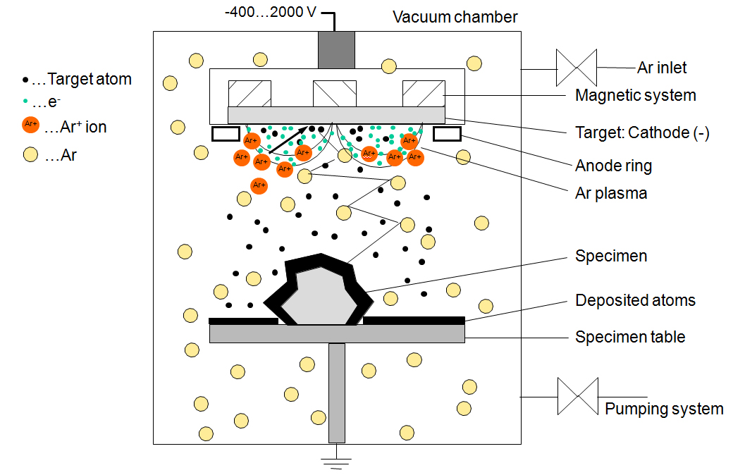 El sputtering se realiza en nuestro caso con oro. Tal y como se muestra en la figura adjunta, haciendo pasar una corriente eléctrica a través del target de oro y en una atmosfera de argón con cierto grado de depresión, las partículas de oro se depositan sobre la superficie de la muestra.