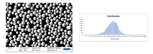Figure 1. SEM image of the atomized powder (left) and Particle Size Distribution histogram (right).
