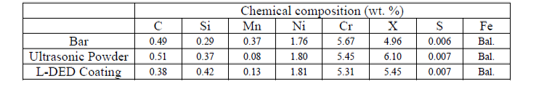 Chemical composition of the bar, powder and hard face coating in wt. %. X element is the sum of all carbide promoters apart from Cr