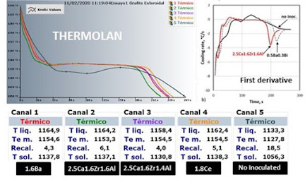 El estudio de las curvas de enfriamiento realizado mediante el sistema de análisis térmico Thermolan® desarrollado por AZTERLAN, permite determinar algunos de los principales parámetros que caracterizan el proceso de solidificación de una pieza, obteniéndose los mejores resultados para los inoculantes ricos en zirconio.