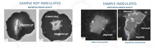 Por su parte, el estudio del proceso de nucleación, realizado a través de mappings, line scan y espectros, ha permitido determinar que las principales inclusiones no metálicas que actúan como puntos de nucleación del grafito esferoidal en las aleaciones de alto silicio son los (MgSiAl)N, presentando todos ellos una clara forma poligonal, los cuales pueden actuar como nucleantes, solos o combinados con otro tipo de inclusiones como complejos sulfuros del tipo (SbCeLa)S o carburos de titanio (TiC) en función de los inoculantes que hayan sido adicionados.