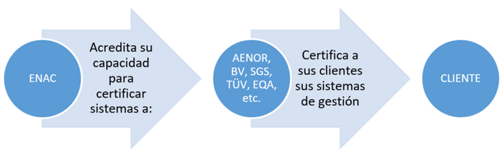 Cuando una organización está certificada significa que ha sido una entidad certificadora la que ha comprobado que los requisitos de la norma que le aplican han sido verificados. Para que una entidad certificadora pueda certificar a una organización, la primera debe haber sido previamente acreditada por alguna entidad de acreditación que haya verificado y aprobado su competencia para certificar a terceras organizaciones. En este caso, es habitual que en cada país haya más de una empresa certificadora. Entre las más conocidas de nuestro entorno encontramos algunas como AENOR, BUREAU VERITAS, SGS, TÜV- RHEINLAND, EQA, etc.