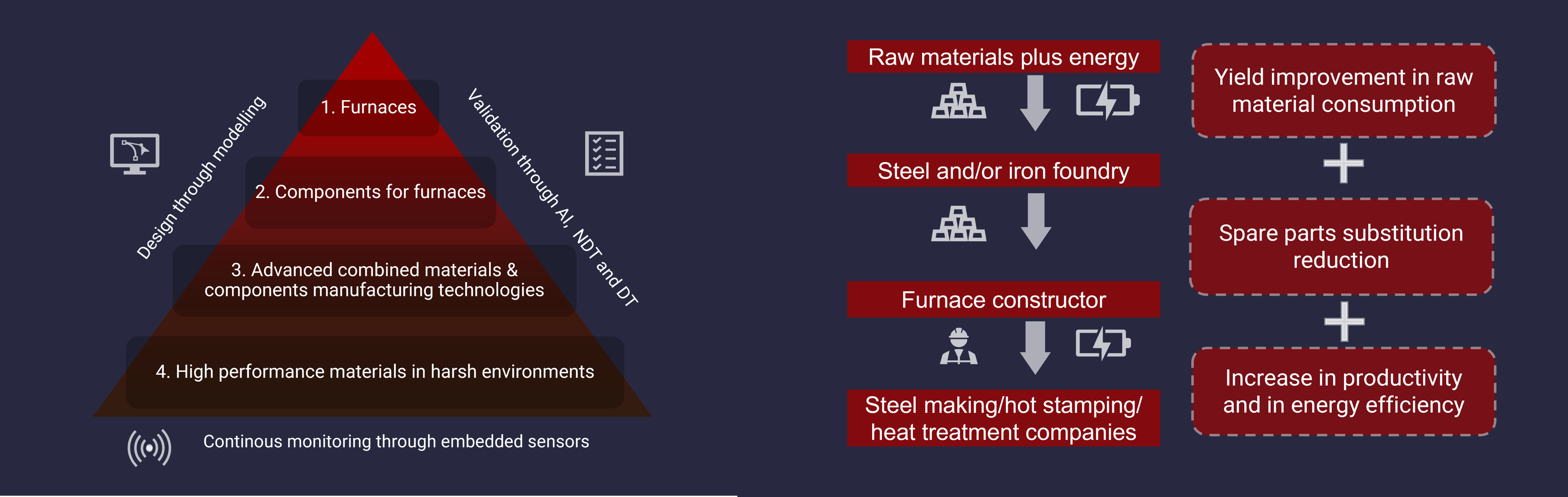 • Integración de componentes en hornos de estampación en caliente industriales operativos junto con sensores de monitoreo desarrollados ad-hoc, combinando tecnologías de pulverización térmica y electrónica impresa, y herramientas avanzadas de procesamiento de datos.