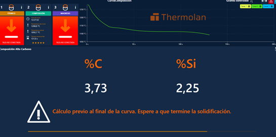 • Ya no tendrás que esperar a la finalización de la curva de solidificación para conocer tus porcentajes de C y Si. En solo 90 segundos Thermolan te ofrecerá una predicción de este importante dato.
