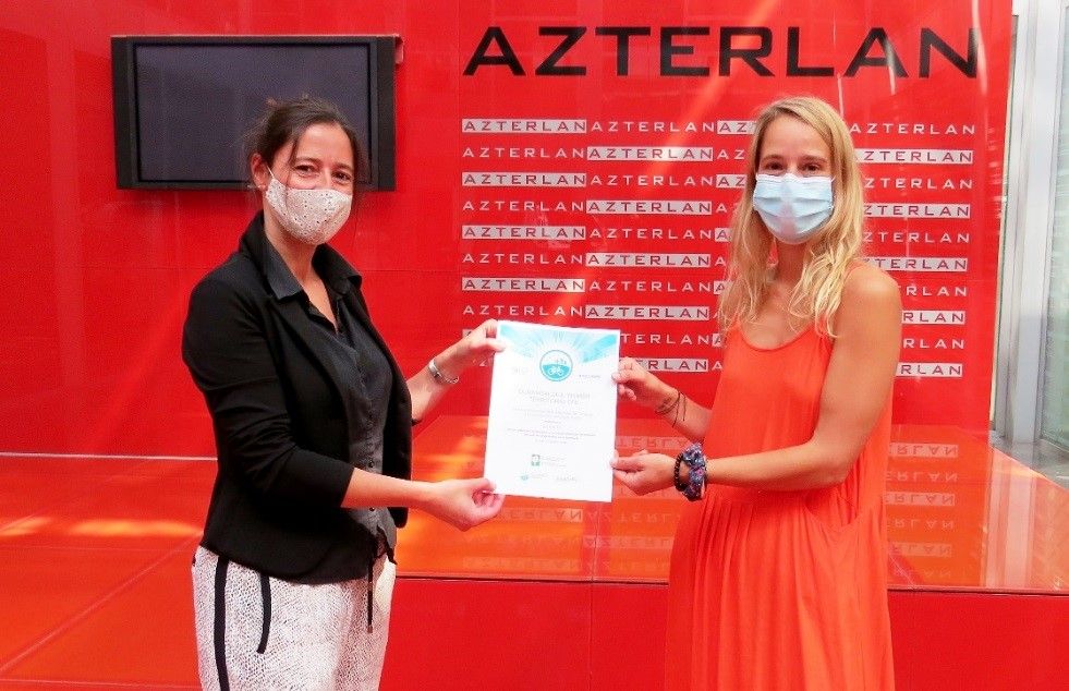 Mireia Elkorobide, Presidenta de la Mancomunidad de Durangaldea, hace entrega del reconocimiento de adhesión al proyecto a Maider Muro, investigadora del Centro Tecnológico AZTERLAN y coordinadora de esta destacada iniciativa.