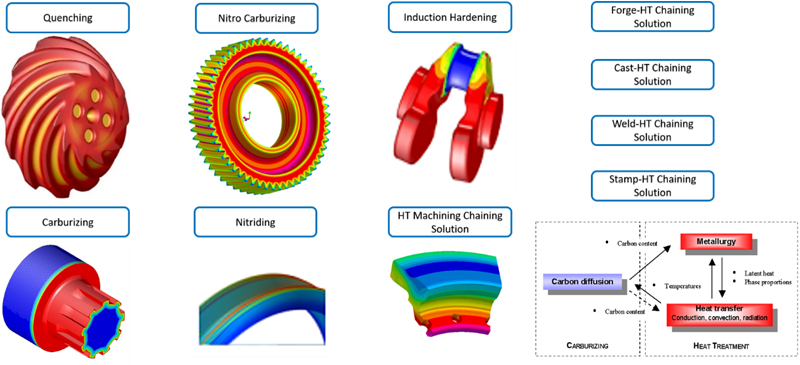 Entre otros, la herramienta permite implementar fuentes de calor y medios de enfriamiento ad-hoc, determinar la evolución de tensiones y deformaciones en los componentes para cada momento de la secuencia de tratamiento térmico, predecir las transformaciones de fase en condiciones de no-equilibrio y calcular las cinéticas de procesos difusivos como la cementación o la decarburación en los aceros.