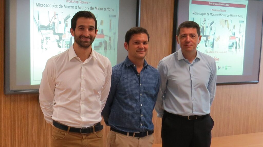 De izquierda a derecha Alberto Torcal (Leica Microsystems), David Peña (IK4-AZTERLAN) y Dionís Díez (Leica Microsystems) y un momento de la exposición.