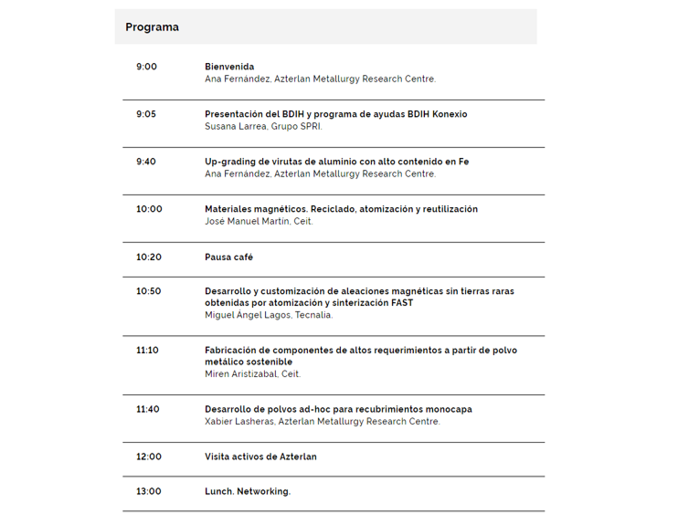 Esta sesión se centrará en fomentar la mejora de los procesos productivos a través del reciclado y la reutilización en la composición de materiales metálicos, con especial atención a las tecnologías de atomización y a la pulvimetalurgia. Además de optimizar los productos y procesos de las pymes vascas, estas innovaciones contribuyen a perseguir el objetivo de la sostenibilidad. En este Deep Dive los asistentes podrán aprender cómo las tecnologías de atomización y pulvimetalurgia pueden mejorar el rendimiento y la eficiencia de sus procesos productivos y tendrán la oportunidad de conocer proyectos completados y casos de uso reales que les ayudarán a introducir estas tecnologías innovadoras en sus organizaciones.
