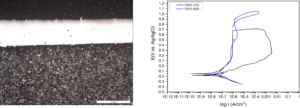 Izda.: Unión entre el material base y el aporte de metal vía cladding; Dcha.: Comparativa de curvas de polarización entre acero inoxidable AISI 316L e Inconel 625.