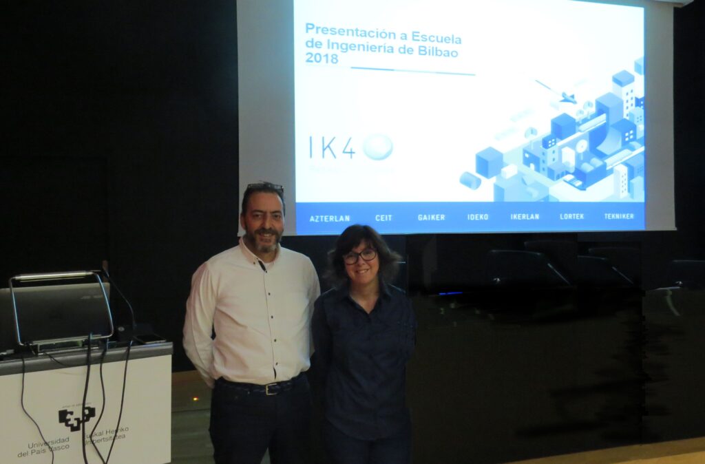 La Doctora Edurne Aguado, investigadora del Centro de Investigación Metalúrgica IK4-AZTERLAN, y Francisco Febrer, miembro del equipo de RR.HH. de IK4-TEKNIKER, han compartido con los alumnos de la universidad la actividad de IK4 y las principales características de la labor investigadora de los Centros Tecnológicos de la Alianza.