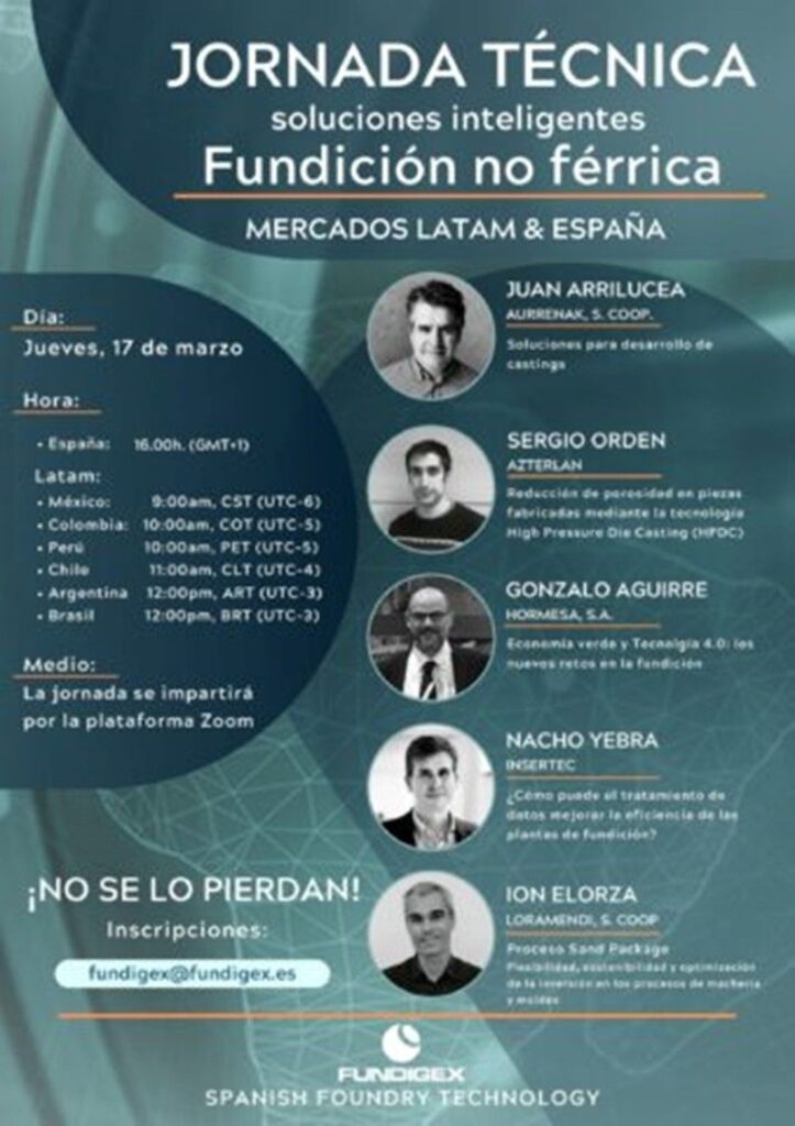 Con el fin de acercar a la industria de fundición no férrea nuevos desarrollos tecnológicos y avances relacionados con ámbitos de creciente importancia para el sector como la sostenibilidad, la digitalización o la fabricación inteligente, la Asociación Española de Empresas de Fundición (FUNDIGEX) ha organizado para el próximo 17 de marzo el encuentro virtual «Soluciones Inteligentes para la Fundición no Férrica», que contará con la participación del Centro de Investigación Metalúrgica AZTERLAN.