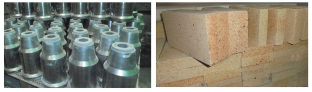 Subproductos obtenidos de la revalorización escorias salinas de aluminio: mortero y cemento de unión de refractarios con encamisados metálicos (izda.), y materia prima empleada en refractarios de 45-60 % Al2O3 (dcha.).