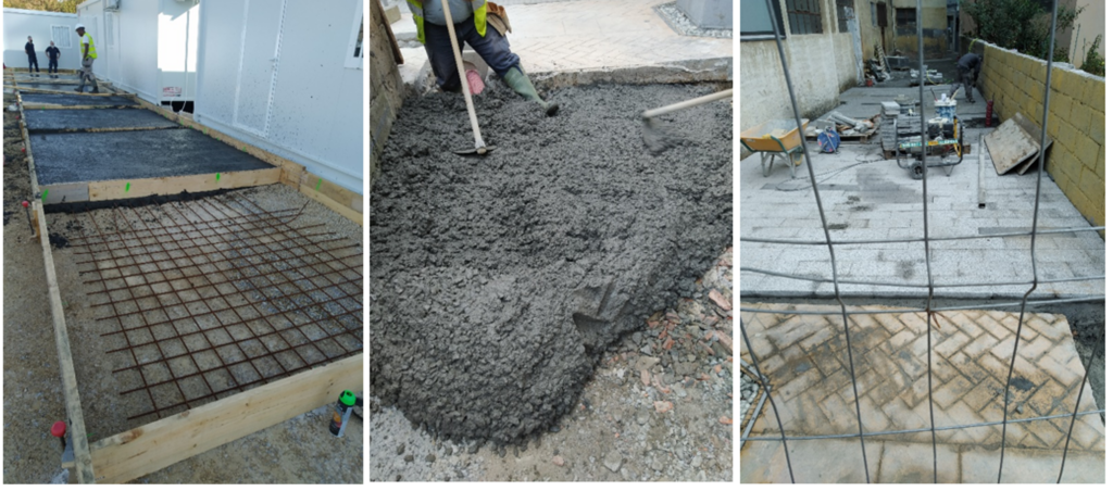 De izquierda a derecha las distintas aplicaciones de los materiales en las obras de 1) Zarautz: Losas de control HM20 siderurgico+arenas fundición 2) Iurreta: Aplicación de hormigón HM20 calizo+arena fundición 3) Iurreta: Aplicación Mortero M5 de albañilería para pavimentación.