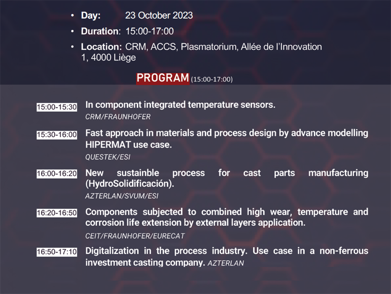El Centro de Investigación Metalúrgica AZTERLAN participará en este encuentro en el que se presentarán algunos de los principales resultados de los proyectos HiperMAT e INEVITABLE y que tendrá lugar 24 de octubre en las instalaciones de CRM en Lieja (Bélgica).